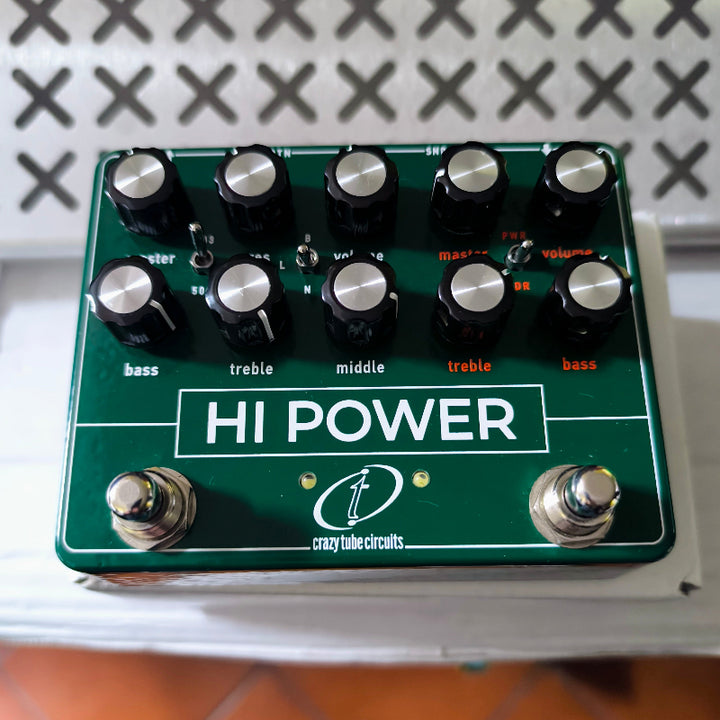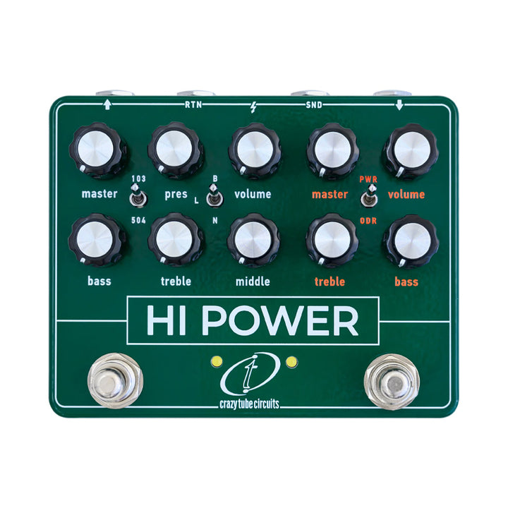 Hi Power è il prossimo impegno nel campo degli overdrive a pedale + amp-in-a-box ispirati alla combinazione sonora di due macchine sonore British che hanno contribuito a modellare il suono dell'album Wish You Were Here dei Pink Floyd. Sul lato destro del pedale troverai una ricreazione del Colorsound Power Boost con i transistor BC184 con specifiche fedeli all'originale che funzionano a 18V CC (tramite un circuito di amplificatore di tensione interno) e il circuito 2 bande ultra flessibile EQ Baxandall. Crazy Tube Circuit ha aggiunto funzionalità extra, come un controllo del volume principale bypassabile, un controllo del gain con registro inverso per garantire una migliore scansione e transizione da pulito a medio (rispetto al cono lineare dell'originale) e un interruttore a levetta per attivare l'ultima versione con gain più alto/haedroom più basso del circuito boost originale chiamato Overdriver. Sul lato sinistro dell'Hi Power troverai un circuito completamente analogico progettato per emulare il suono e la sensazione di un amplificatore Hiwatt. Seguendo il percorso del famoso amplificatore valvolare British, il circuito offre il suono e la sensazione autentica dell'amplificatore. Dai grandi suoni puliti e audaci con un'elevata headroom ai suoni croccanti che scioglieranno il viso. Fedeli fino all'ultimo dettaglio, Crazy Tube Circuit ha incluso l'intera sezione EQ insieme ad un controllo di presenza situato sul feedback negativo del circuito di simulazione dell'amplificatore di potenza. Un interruttore a levetta per l'headroom seleziona tra la sezione di potenza da 100W con headroom elevato fornita da un quartetto di EL34 o l'headroom più basso e la compressione fornita da una sezione di potenza da 50W con una coppia di EL34 quando viene colpita duramente. Simile nel funzionamento al design dell'amplificatore originale, il controllo del volume principale è stato progettato per produrre più guadagno con impostazioni più alte. Crazy Tube Circuit ha portato il suo design un ulteriore passo avanti aggiungendo un interruttore per selezionare tra i canali di ingresso. E' possibile scegliere tra la risposta in frequenza completa del canale normale dell'amplificatore, la maggiore presenza e i bassi stretti dell'ingresso del canale light o la risposta in frequenza migliorata e il gain aggiuntivo di quegli ingressi collegati insieme. Come gli altri design dual overdrive/amp-in-a-box, Crazy Tube Circuit ha incluso anche un loop di effetti passivi per darti la possibilità di collegare i tuoi amati pedali tra il tuo booster/overdrive e l'amplificatore in un box o utilizzare le due sezioni come separate e effetti indipendenti quando si utilizza un commutatore/looper di bypass esterno. Hi Power dispone anche di una funzione preimpostata di bypass/attivazione all'accensione per i footswitch integrati. In questo modo puoi selezionare lo stato in cui andrà il tuo pedale quando colleghi l'alimentatore. Questa funzione è particolarmente utile per le persone che utilizzano commutatori/looper a pedale remoti poiché impostano lo stato di accensione del pedale solo una volta e quindi operano dal controller.