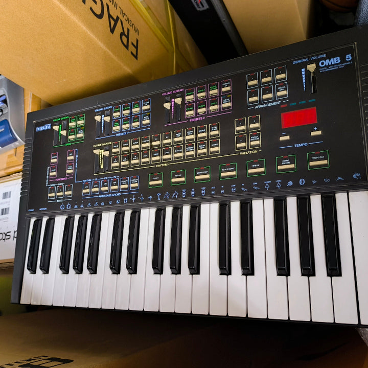 L'OMB 5 di Elka, noto anche come "One Man Band", è uno strumento sintetizzatore arranger basato su FM e PCM Rom. Ci sono due sintetizzatori FM a bordo insieme a un sintetizzatore PCM / Wavetable per la batteria. Con questo synth hai praticamente (oltre ai sintetizzatori) un Drumstar 80 (Elka) e una batteria con campionamenti simili a Linn! Questa è una macchina fantastica per un viaggio negli anni '80 e per produzioni Italo Disco, New Wave e Synthwave. La sezione sintetizzatore FM offre 24 preset di suoni di synth. Non sono disponibili funzionalità di editing, tuttavia l'utente può sovrapporre due suoni tra loro, creando arrangiamenti interessanti e dal suono più corposo. La sezione sequencer può contenere fino a 9 parti, rendendolo multitimbrico a 9 parti. È presente anche un accompagnamento automatico per basso all'interno del sequencer arranger con funzioni disponibili come tempo, variazione e ritmo.