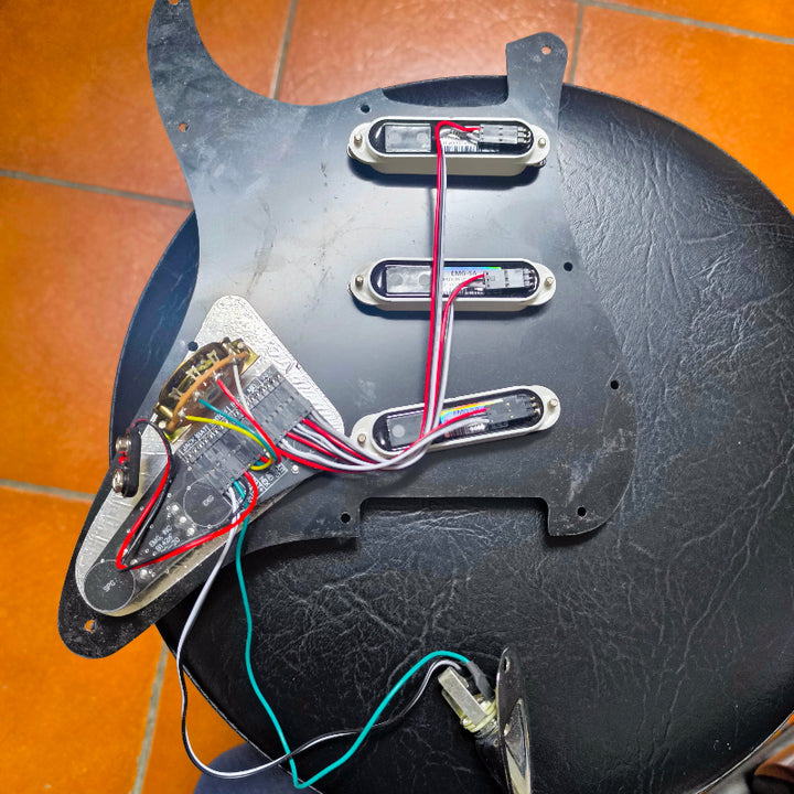 David Gilmour è riconosciuto in tutto il mondo per il suo suono rivoluzionario e inarrivabile con i leggendari Pink Floyd e per il suo lavoro come artista solista. Quando senti i suoni che escono dalla sua Strat rossa, senti il suo sistema EMG Pro Series caratteristico: il DG20. Questo set utilizza i pickup EMG Single Coil SA in Alnico, un EXG Guitar Expander per frequenze alte e basse incrementate ed un controllo SPC della presenza per migliorare la terrosità e la gamma media della tua Stratocaster. Il sistema è precablato su un battipenna nero a 11 fori con manopole bianche per una facile installazione.