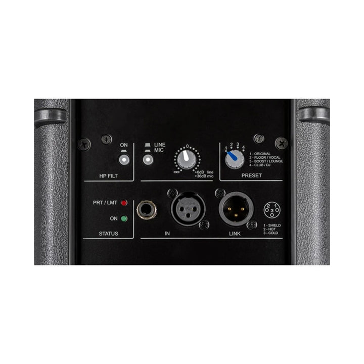 - Pannello di controllo: XLR IN e XLR LINK, Volume, Preset EQ, filtro HP, selettore GND LFT