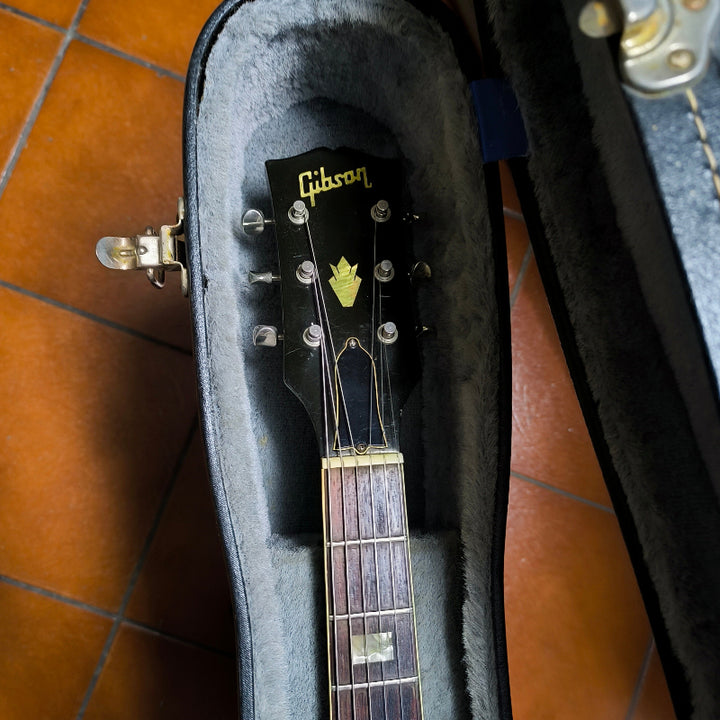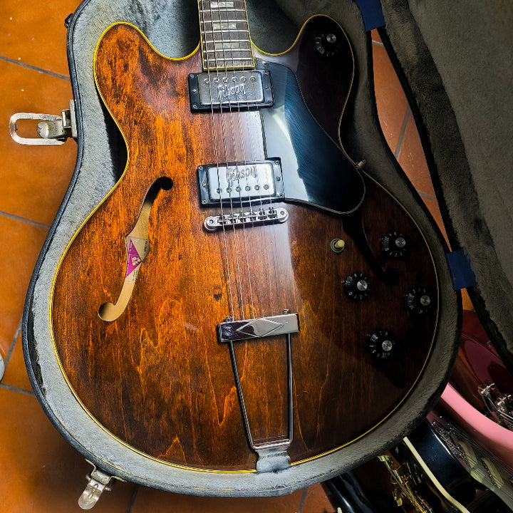 Gibson ES-150 DC del 1972 con finitura Walnut in buone condizioni per la sua età! La finitura Walnut non è sbiadita per niente e rivela la bella venatura del corpo in acero. Queste rare Gibson ES-150 DC assomigliano quasi a una ES-335, fatta eccezione per il corpo spesso 3" e per l'assenza del sustain-block. Fisicamente e sonoramente, la ES-150 DC è più una ES-175 e l'unica Gibson a doppio cutaway con corpo cavo mai realizzata con humbucker! Ha due humbucker Gibson "Pat.Nr." con uscite ben bilanciate e un suono fantastico, con master volume sulla spalla mancante inferiore. I copri humbucker hanno la scritta "GIBSON" in rilievo su entrambi i coperchi, caratteristica che si trova solo sui modelli del 1972! Il peso è piacevolmente leggero, solo 2,39 kg, questa chitarra suona divinamente, sia elettrificata che acustica.