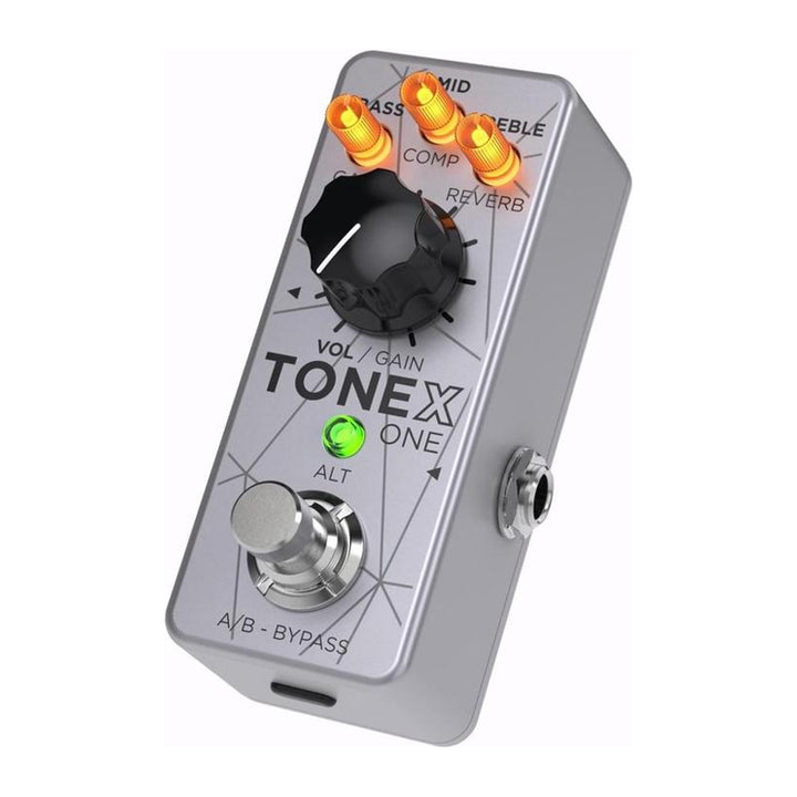 ToneX One Bass Edition di IK Multimedia porta la rivoluzionaria tecnologia AI Machine Modeling su qualsiasi pedaliera, consentendo di suonare con i timbri più ricercati in un formato ultra-compatto. È un pedale mini ma estremamente potente, in grado di memorizzare fino a 20 preset con modelli di ampli, cabinet e stomp realistici, scelti da una libreria pressoché infinita di oltre 45.000 Tone Models disponibili su ToneNET. Precaricato con 20 preset pronti per il live e compatibile con la Signature Bass Collection, offre un accesso immediato a suoni leggendari: dalle timbriche pulite vintage al punch moderno, fino a drive e saturazioni di riferimento. Grazie al supporto VIR™ multi-IR e al caricamento di IR personalizzate, consente la massima flessibilità sonora, mentre i 15 effetti onboard (EQ, compressori, modulazioni, delay, riverberi, noise gate, accordatore smart) garantiscono un setup completo in ogni contesto. Con due modalità operative (Stomp On/Off e Dual A/B), uscita TRS stereo/mono che funge anche da uscita cuffie e interfaccia USB-C per registrazione diretta e gestione preset, Tonex One Bass rappresenta una soluzione portatile e versatile per prove, palco e studio. Il design compatto con micro-knob retroilluminati RGB personalizzabili lo rende pratico e intuitivo anche in condizioni di palco. Incluso nella confezione: software ToneX SE, Tonex Editor e AmpliTube 5 SE, per modellare, organizzare e integrare i propri suoni nell’intero ecosistema ToneX.