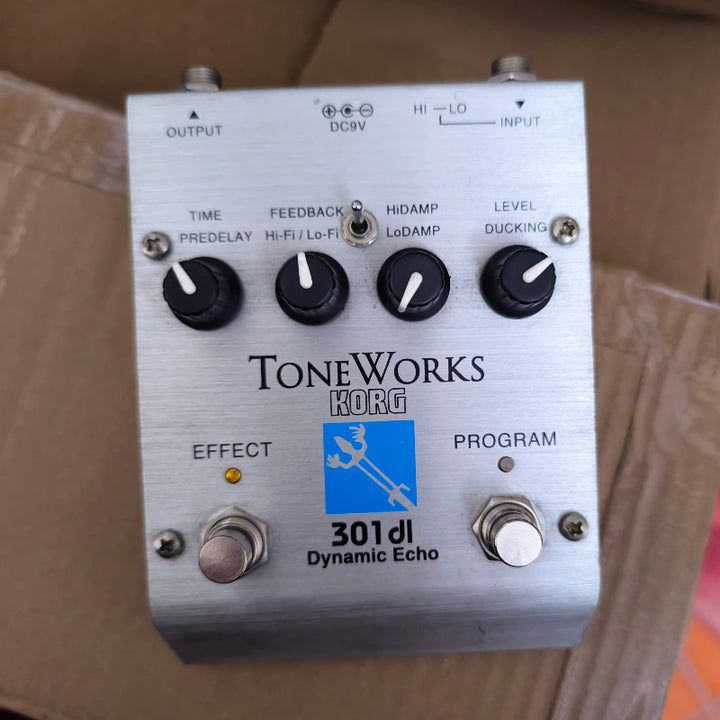 Il Korg ToneWorks 301dl Dynamic Echo è un pedale delay estremamente versatile della serie Nazca-line di metà anni '90, alloggiato nello stesso robusto telaio metallico con grafica a geoglifi Nazca. Offre delay programmabili con funzionalità avanzate che lo rendono uno strumento essenziale sia per l'uso dal vivo che in studio. Il 301dl offre fino a 1 secondo di delay e include controlli Pre-Delay e Feedback per modellare il timing e il numero di echi. I controlli Hi-Fi e Lo-Fi consentono agli utenti di impostare ripetizioni impeccabili o emulare il carattere degli echi a nastro e analogici, mentre High Damp e Low Damp regolano il roll-off tonale in entrambe le direzioni per un controllo preciso sulle ripetizioni. La caratteristica funzione Ducking del pedale sopprime automaticamente gli echi durante l'esecuzione e li ripristina quando le note decadono, garantendo la massima chiarezza nelle prestazioni. Con due slot di memoria programmabili, interruttori di guadagno in ingresso e livello di uscita e una solida qualità costruttiva, il 301dl è progettato per la massima flessibilità e affidabilità.