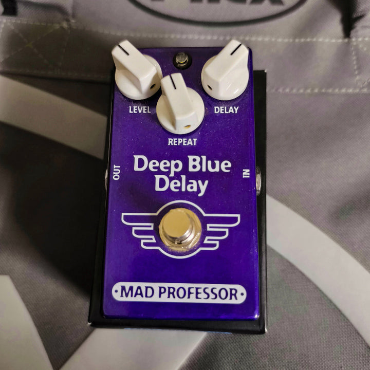 Il Deep Blue Delay è un delay digitale/analogico dal suono naturale, con il percorso del segnale diretto analogico. Il Deep Blue Delay ha all'incirca la stessa larghezza di banda delle classiche unità di eco a nastro e può essere utilizzato prima di un amplificatore o nei loop di effetti. Non ci sono circuiti di riduzione del rumore, il che mantiene il decadimento dell'eco il più naturale possibile. Il percorso diretto del segnale è breve e realizzato con amplificatori analogici senza filtraggio. Non sono presenti distorsioni o colorazioni tonali fintanto che il livello di ingresso è nell'intervallo inferiore al massimo consentito. Il segnale eco ha un filtraggio sintonizzato per consentire impostazioni estreme senza interferenze. Il delay è appositamente progettato per funzionare bene anche con toni distorti, poiché questa è l'applicazione più critica, dove spesso i delay falliscono. Il Deep Blue Delay contiene le funzioni di base, Delay Time, Delay Level and Repeat, ed é stato progettato per funzionare come delay ambientale. Come un'eco a nastro vintage e repeat, è stato appositamente progettato per consentire una facile regolazione e un'impostazione meno critica del tempo di ritardo. Perché digitale? Non è meglio analogico per una soluzione solid-state? Mad Professor ha scelto la costruzione digitale per renderla compatta, stabile, con tempi di ritardo ragionevoli e virtualmente esente da manutenzione. Un circuito simile in forma analogica sarebbe stato eccessivamente più costoso da realizzare. Per le stesse prestazioni, sarebbero stati necessari da tre a quattro dei migliori chip BBD ora disponibili solo come parti vintage e la dimensione del pedale circa tre volte la dimensione attuale.